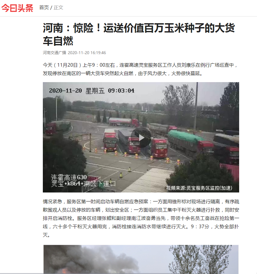 人民日報、河南交通廣播、熱門微博、大象新聞、今日頭條、抖音:《驚險!運送價值百萬玉米種子的大貨車自燃》